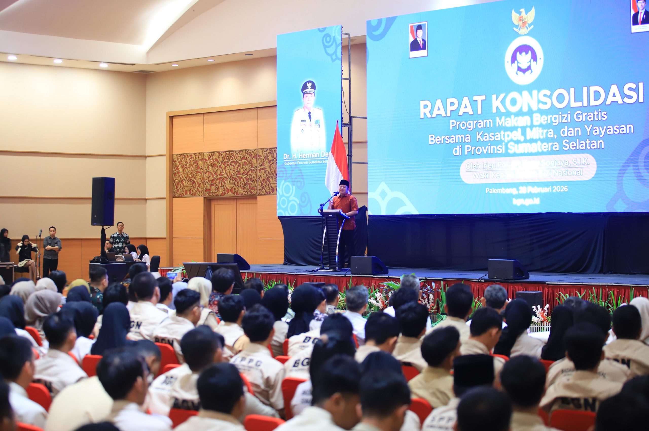 Koran Musi, Palembang – Gubernur Sumatera Selatan (Sumsel), Dr. H. Herman Deru, menegaskan komitmen penuh Pemerintah Provinsi Sumsel dalam mendukung dan menyukseskan Program Makan Bergizi Gratis (MBG). Penegasan tersebut disampaikannya saat menghadiri Rapat Konsolidasi Program MBG bersama kasatpel, mitra, dan yayasan se-Provinsi Sumsel di Hotel Aryaduta Palembang, Sabtu (28/02/2026) siang.